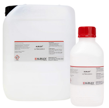 ALBILEX®-ULTRACLEAN-5 is a nearly neutral concentrate cleaning agent for immersion and ultrasonic and manual use. It removes solid contaminations like soot, graphite, metal dust and polishing paste. It is used to clean up high gloss polished parts. ALBILEX®-ULTRACLEAN-5 creates a thin hydrophobic layer which performs a good protection against corrosion. In case of usage in electroplating processes the hydrophobic layer should be removed afterwards by electrolytic degreasing (i.e. ALBILEX®-ED-100).
